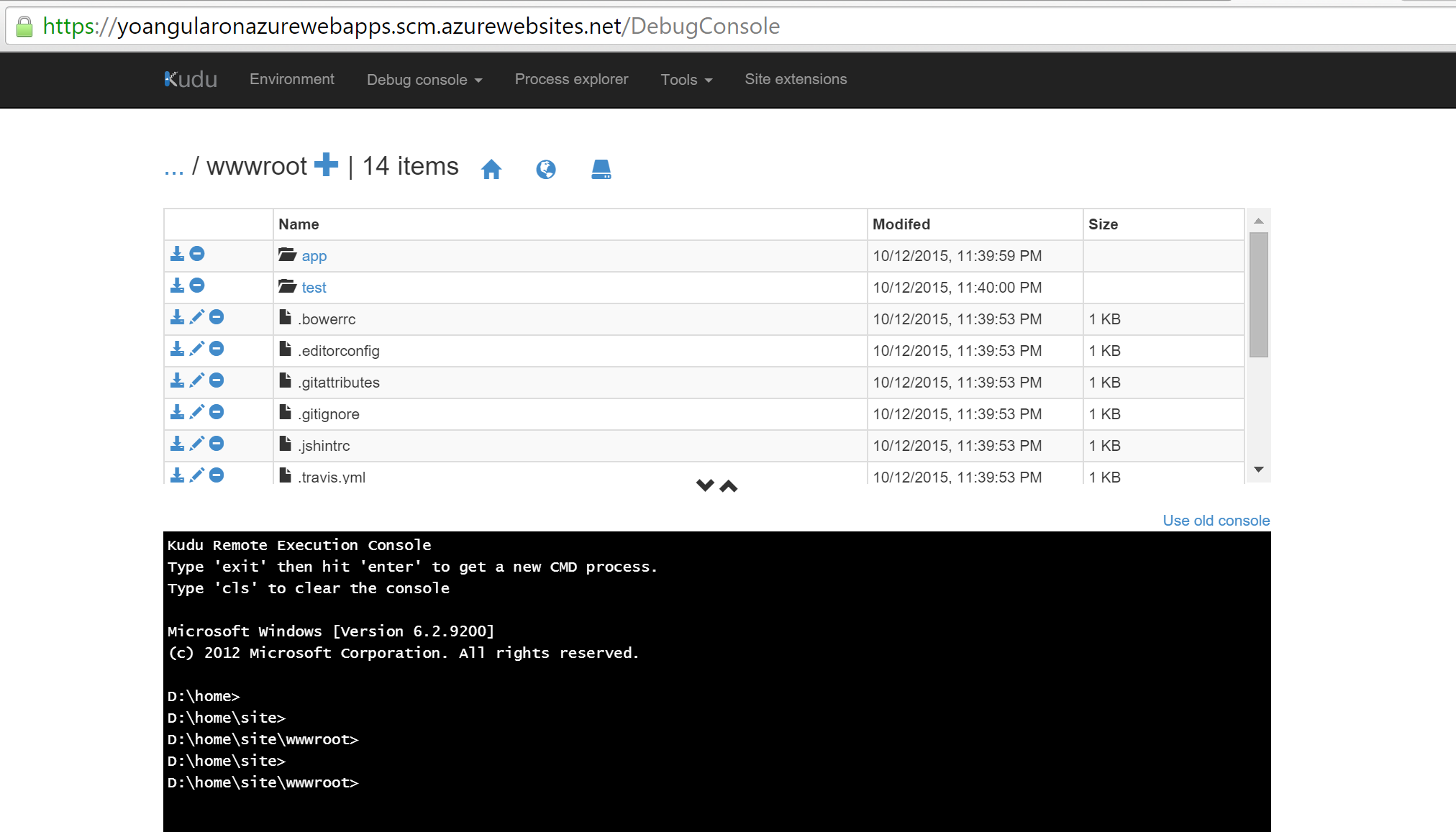 Luckily all Azure Web Apps come with a handy Kudu site that gives you command line access to your site. You can get to it at https://<yourSiteName>.scm.azurewebsites.net\DebugConsole.