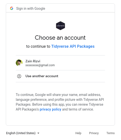 Log in and give Tidyverse the permissions it’s requesting. It’ll take you to a screen giving you a secret code: