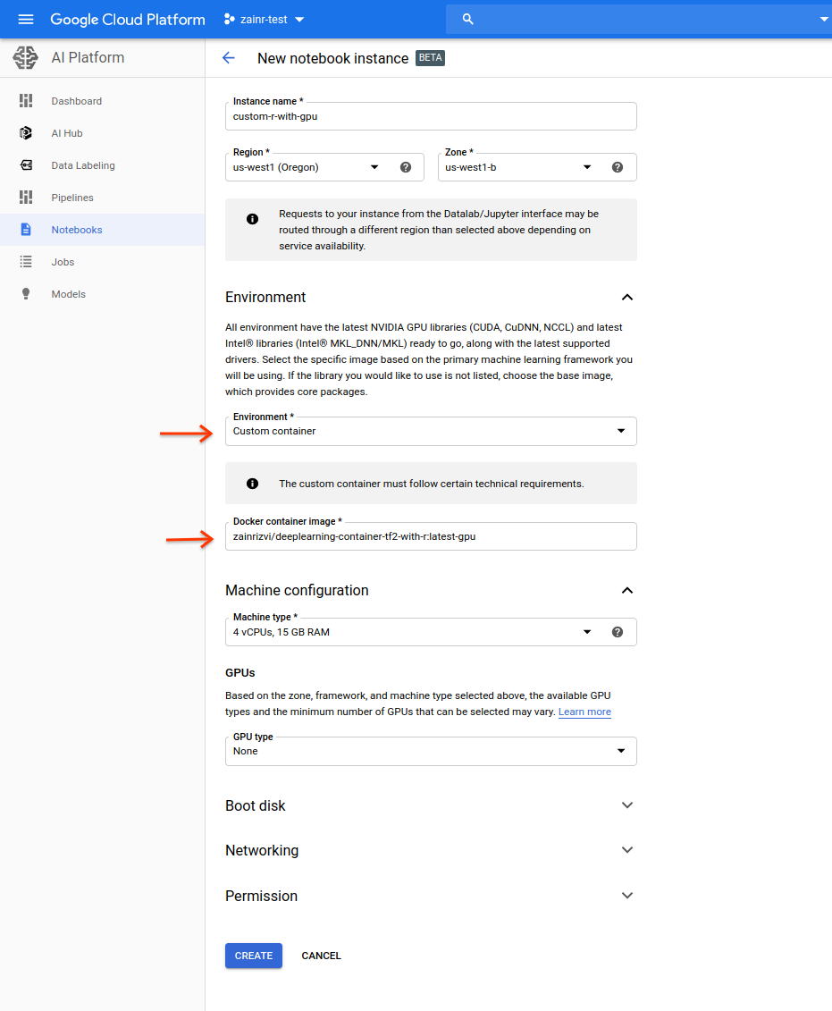 Then in the “Docker container image” box enter the path to the registry you pushed your image to. Mine is: zainrizvi/deeplearning-container-tf2-with-r:latest-gpu