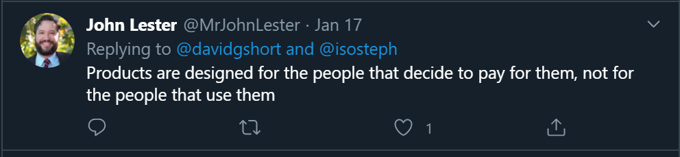 But if your users are captive, then like it or not, their needs are less critical to your business. The product only needs to be “good enough” for them to do their job.