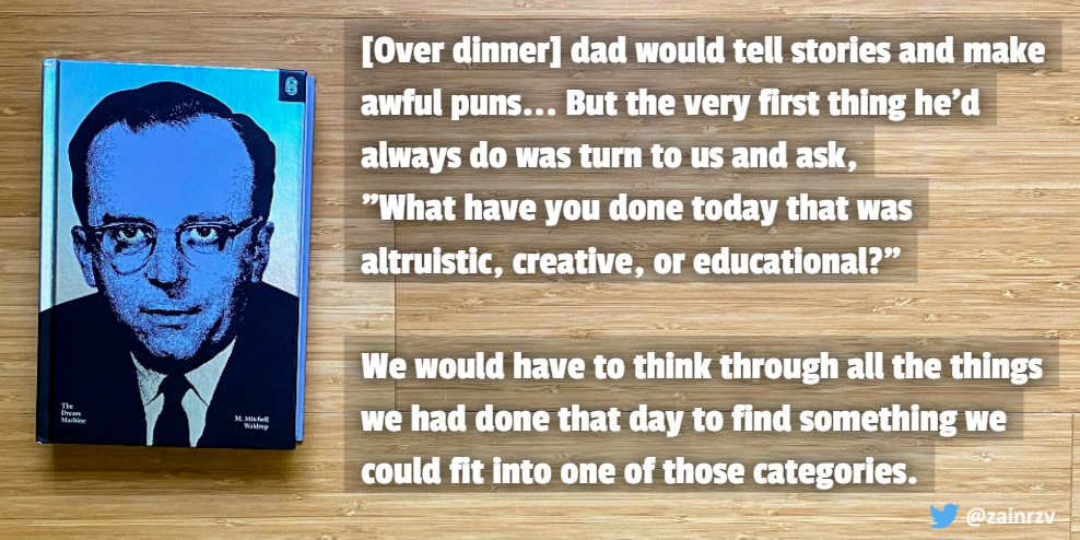 “What have you done today that was altruistic, creative, or educational?” JCR Licklider, founder of computing, kicked it up a notch and gave his kids three things to focus on. The excerpt below shows his kid’s response